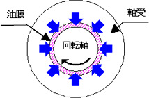 図2の軸と軸受の相対すべり運動によって軸受すきまに存在する流体潤滑膜に圧力(動圧)を発生させ、荷重を支える。